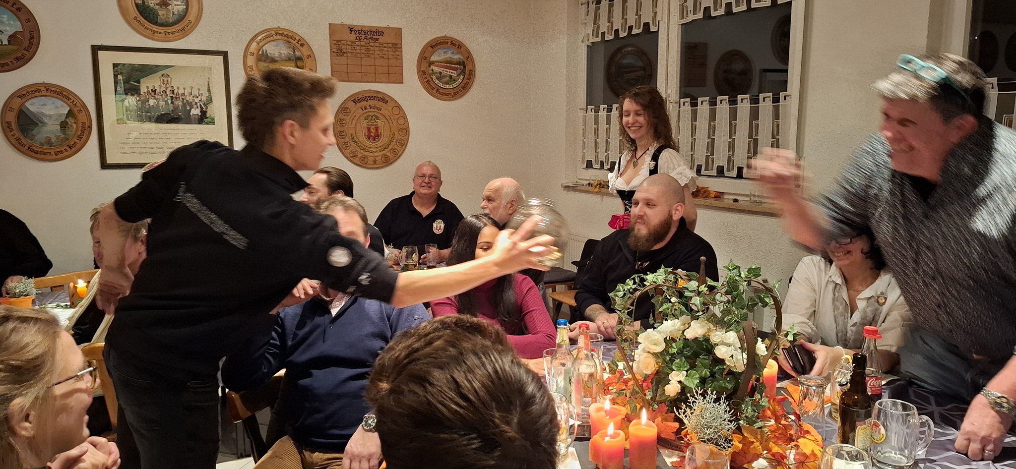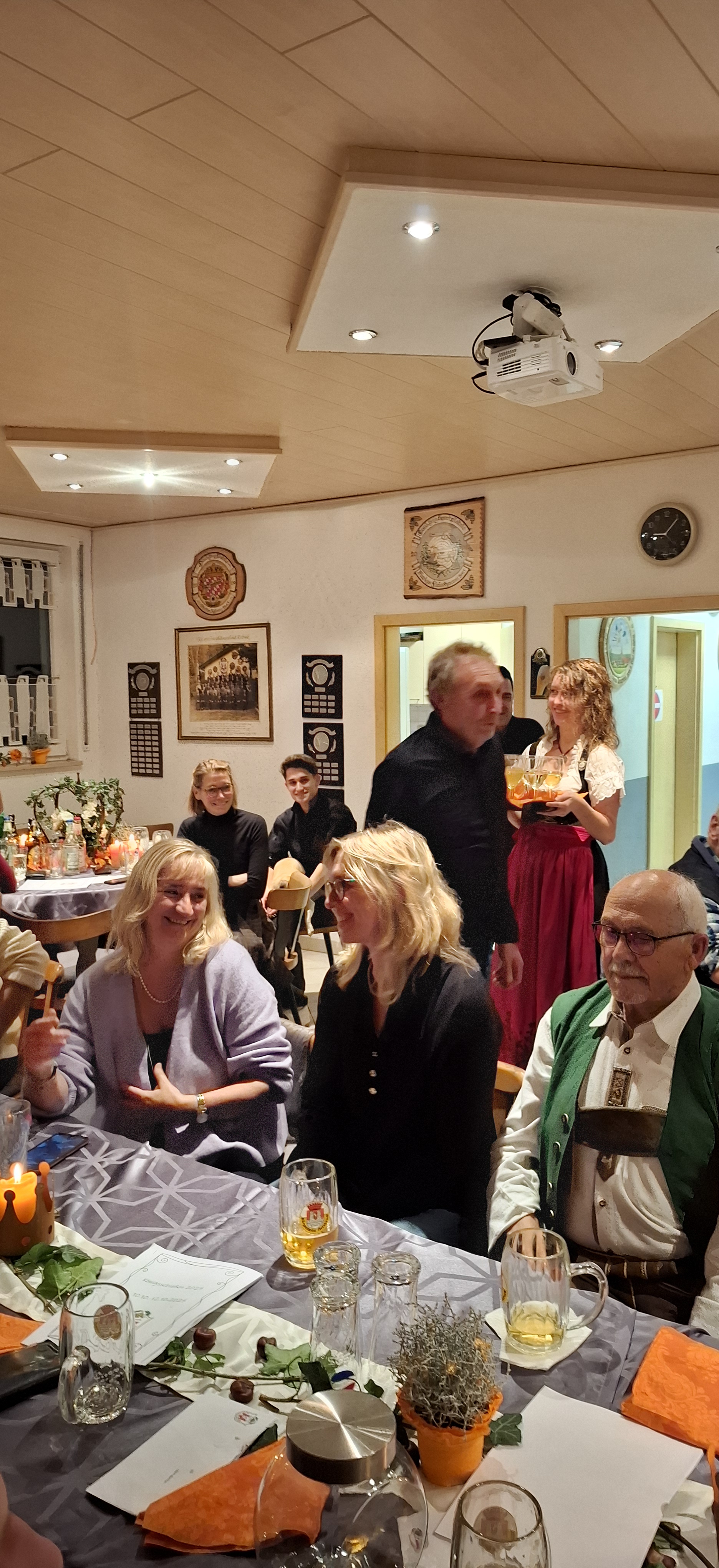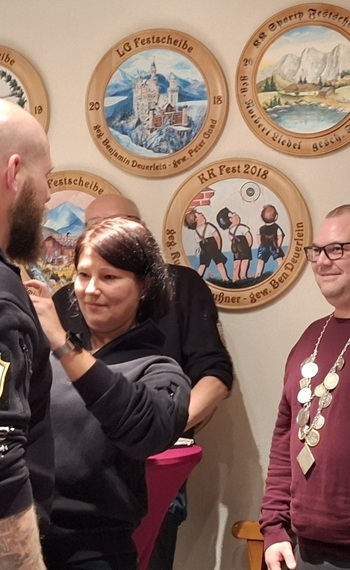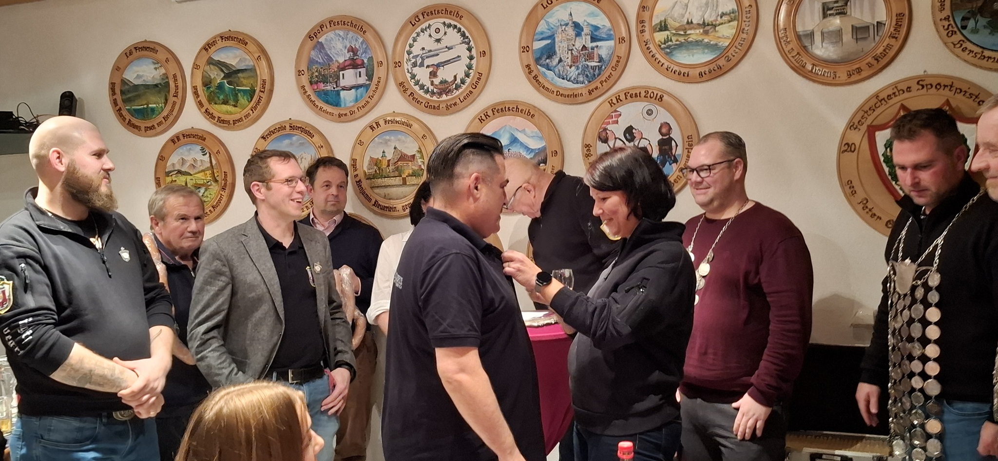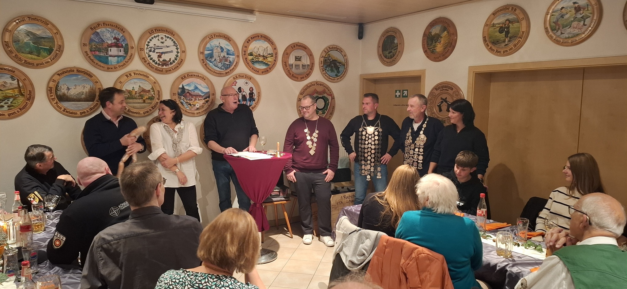 Am 25.10.025 feierten wir unsere diesjährige Königsfeier mit Proklamation unserer neuen „Regenten“. Die Veranstaltung war sehr gut besucht. Unser Schützenstüberl war bis auf den letzten Platz voll besetzt. Auch in diesem Jahr ließen wir uns ein ganz hervorragend zubereitetes Spanferkel schmecken. Neu war in diesem Jahr, dass wir die Gelegenheit dieses feierlichen Rahmens dafür nutzten, um auch unsere erfolgreichen Teilnehmer an den deutschen Meisterschaften, (Julian Brandmeier und Hermann "Pulver Joe" Mörtel jeweils zum Meistertitel, Rudi Pickel zu Platz zwei, sowie Maximilian Zaus zu einem dritten Platz), gebührend zu ehren. Ein kurioses Novum ergab sich beim diesjährigen Königsschießen, da unser Schützenbruder Michael Krammer es tatsächlich darauf anlegte, alle drei zu vergebenden Stadtwurstringe zu gewinnen. Um nicht in ein „Stadtwurst-Koma“ zu fallen, spendete er zwei Stadtwurstringe. Dafür vielen Dank. Einen der beiden Spende-Stadtwurst-Ringe vergaben wir für den am weitesten vom Ziel entfernten, beim Königsschießen abgegebenen Schuss an Jürgen Mühlbauer, der sich trotzdem über den Preis freute. Den dritten Ring haben wir im Rahmen einer recht kurzweiligen amerikanischen Auktion versteigert. Der Zuschlag ging an Jan Schels. An dieser Stelle gratulieren wir dem erfolgreichen Bieter und danken allen nicht erfolgreichen Bietern.