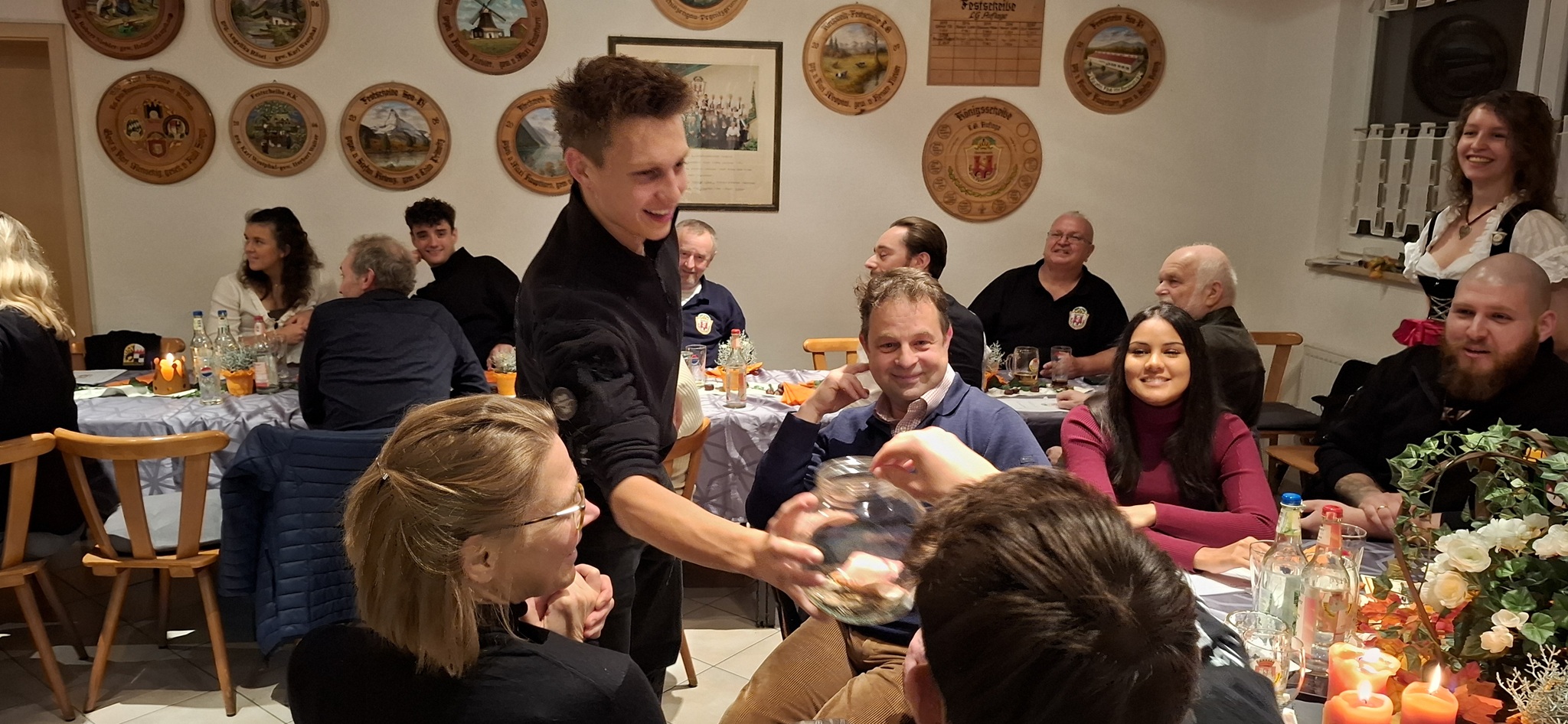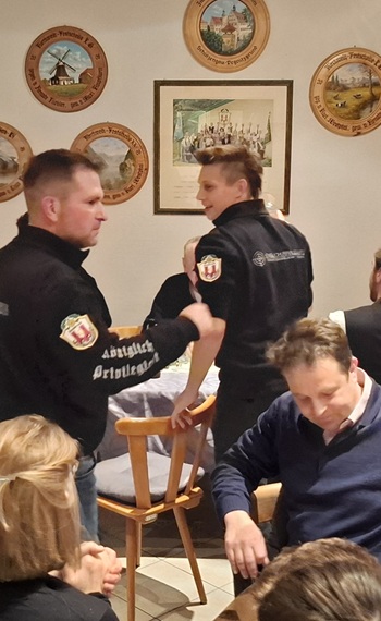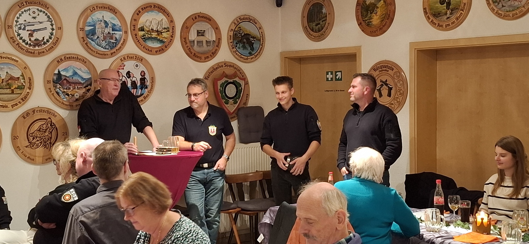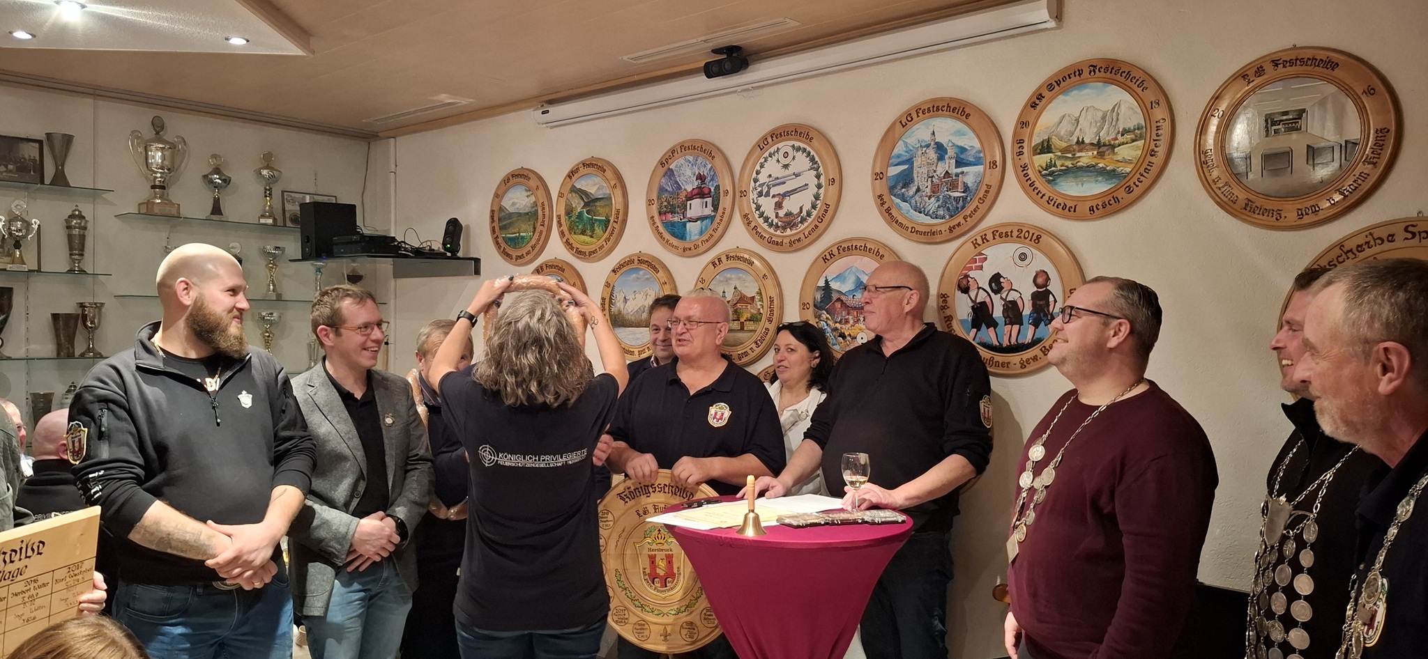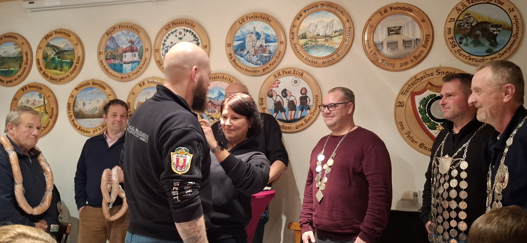 Am 25.10.025 feierten wir unsere diesjährige Königsfeier mit Proklamation unserer neuen „Regenten“. Die Veranstaltung war sehr gut besucht. Unser Schützenstüberl war bis auf den letzten Platz voll besetzt. Auch in diesem Jahr ließen wir uns ein ganz hervorragend zubereitetes Spanferkel schmecken. Neu war in diesem Jahr, dass wir die Gelegenheit dieses feierlichen Rahmens dafür nutzten, um auch unsere erfolgreichen Teilnehmer an den deutschen Meisterschaften, (Julian Brandmeier und Hermann "Pulver Joe" Mörtel jeweils zum Meistertitel, Rudi Pickel zu Platz zwei, sowie Maximilian Zaus zu einem dritten Platz), gebührend zu ehren. Ein kurioses Novum ergab sich beim diesjährigen Königsschießen, da unser Schützenbruder Michael Krammer es tatsächlich darauf anlegte, alle drei zu vergebenden Stadtwurstringe zu gewinnen. Um nicht in ein „Stadtwurst-Koma“ zu fallen, spendete er zwei Stadtwurstringe. Dafür vielen Dank. Einen der beiden Spende-Stadtwurst-Ringe vergaben wir für den am weitesten vom Ziel entfernten, beim Königsschießen abgegebenen Schuss an Jürgen Mühlbauer, der sich trotzdem über den Preis freute. Den dritten Ring haben wir im Rahmen einer recht kurzweiligen amerikanischen Auktion versteigert. Der Zuschlag ging an Jan Schels. An dieser Stelle gratulieren wir dem erfolgreichen Bieter und danken allen nicht erfolgreichen Bietern.