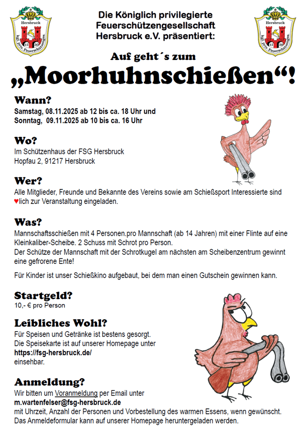 Am 08.11.2025 und 09.11.2025 laden wir herzlich zu einem lustigen Moorhuhn-Schießen in unserem gemütlichen Vereinsheim in Hersbruck ein. Keine Sorge, es wird nicht auf echte Tiere geschossen!